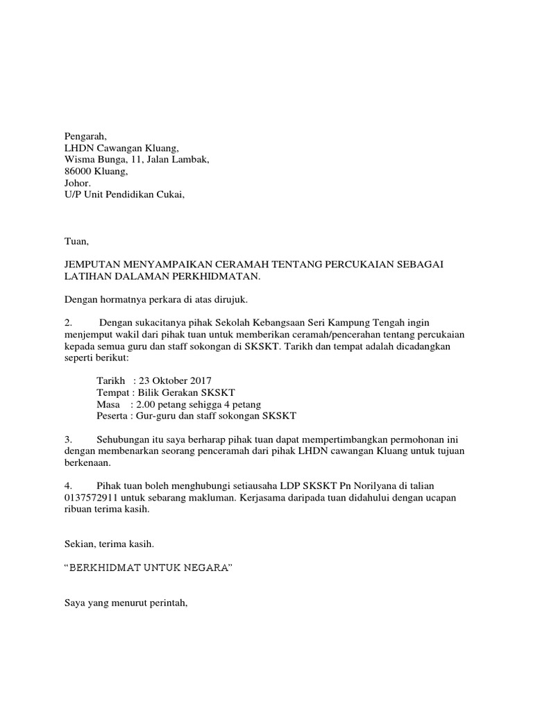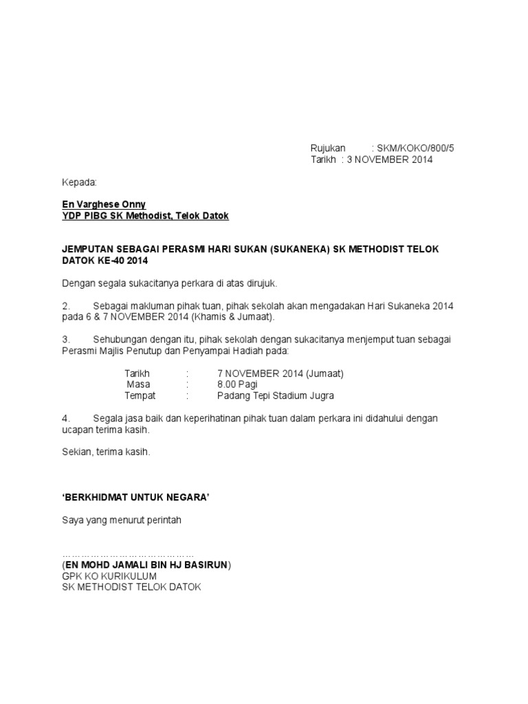 Surat kuasa dibuat oleh seseorang yang memiliki kesibukan atau halangan tertentu dan diberikan kepada orang lain yang terpercaya dikarenakan yang bersangkutan tidak dapat melakukan suatu hal. Biasanya surat ini dilengkapi dengan materai sebagai penguat kepercayaan dan agar terlihat kredibel. Sekolah kebangsaan lktp air tawar 4, 81900 kota tinggi, johor. Related image with contoh surat jemputan sebagai perasmi. Sekolah menengah sultan abdul jalil shah, seberang perak, 36000 teluk intan, perak kod sekolah :