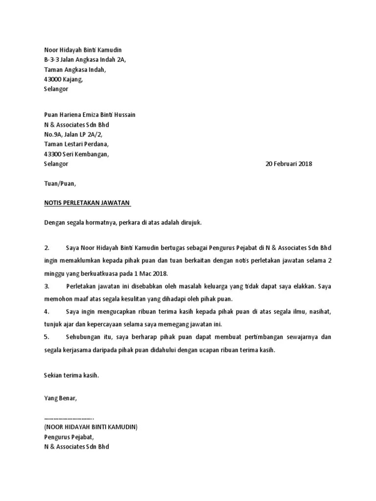 Untuk makluman pihak puan tujuan perletakan jawatan saya adalah disebabkan saya tidak yakin mampu untuk memikul tanggungjawab dan amanah yang telah diberi dengan sempurna. Berdasarkan maklumat tertera di atas, saya nama anda menulis surat perletakan jawatan ini sebagai nama jawatan dengan syarikat masdo sdn bhd. Kali ini admin nak kongsikan surat perletakan jawatan untuk notis sebulan atau notis 30 hari atau lebih bergantung kepada kontrak perkhidmatan yang sebenarnya untuk menulis surat perletakan jawatan atau berhenti kerja ini adalah sungguh mudah dan cepat. Apabila anda ada hasrat untuk melepaskan jawatan di tempat kerja, anda diwajibkan memberitahu kepada pihak syarikat dengan menghantar surat perletakan jawatan. Sedemikian itu, untuk berhenti kerja mestilah membuat surat mengikut format surat yang betul dan mengikut piawaian. Surat perletakan jawatan penting dalam menunjukkan komitmen dan kerjasama anda dalam sesebuah pekerjaan yang anda berkecimpung selama ini. Perletakan jawatan sebagai pegawai perubatan ud…… 2. Dalam dunia pekerjaa sektor swasta. Yang pertama ialah yang berkaitan dengan kerja (yang ada gaji). Surat perletakan jawatan sambung belajar. Contoh surat rasmi berhenti kerja bahasa melayu dan bahasa inggeris. Seperti kita sedia maklum, surat perletakan jawatan merupakan notis pemberitahuan berhenti kerja kepada majikan. 4 contoh surat letak jawatan ikut situasi, notis 24 jam, 2 minggu, sebulan versi bm.