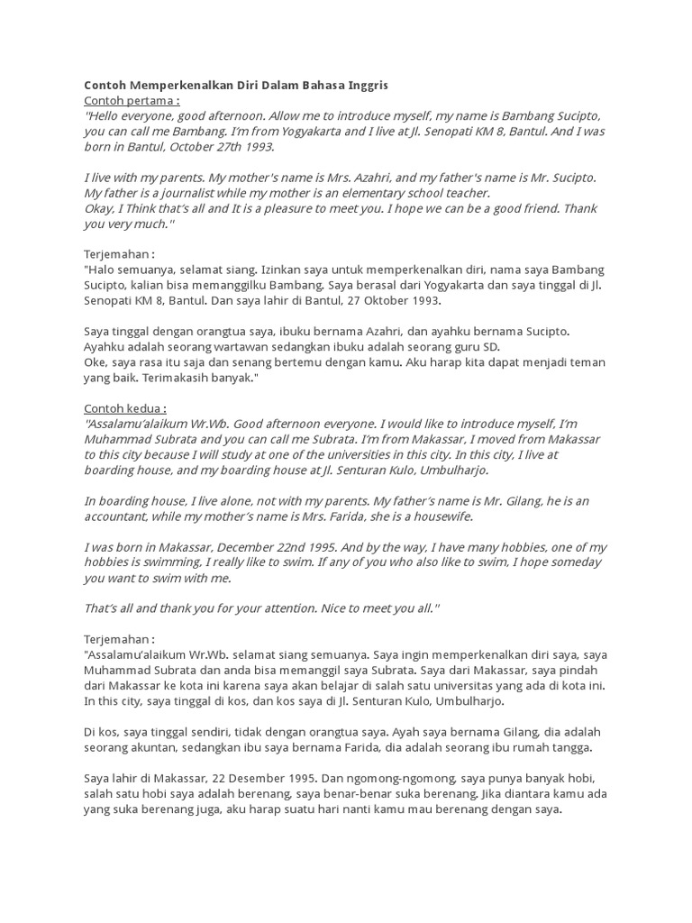 Contoh kalimat perkenalan diri dalam bahasa inggris lengkap dan. Cara memperkenalkan diri dalam bahasa inggris singkat dan artinya. Saya lahir di denpasar, bali tanggal 28 september senang bisa memperkenalkan diri. Cari kursus bahasa inggris yang berani memberi jaminan uang kembali. Hello, let me introduce myself here.