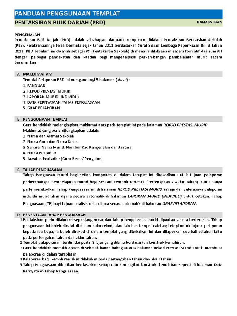 Templat pelaporan pbd (pentaksiran bilik darjah). Pelaksanaannya telah bermula sejak tahun 2011 berdasarkan surat siaran lembaga peperiksaan bil. Pbd (pentaksiran bilik darjah) dilaksanakan secara formatif dan sumatif dengan pelbagai pendekatan dan kaedah bagi mengenal pasti perkembangan pembelajaran murid dengan lebih efektif dan secara keseluruhan. Pbd berlaku secara formatif dan sumatif; Templete pelaporan bilik darjah tahun 4 2020.