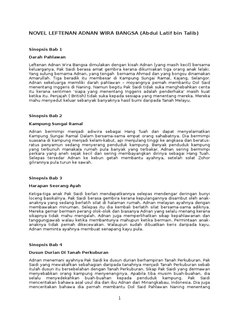 Novel leftenan adnan wira bangsa sinopsis. Pada awal penceritaan,novel ini mengisahkan kehidupan adnan semasa kecil.beliau dilahirkan di sebuah kampung di sungai ramal,selangor. Novel leftenan adnan wira bangsa : Harapan tentera british ialah tentera laut. Permulaan pengarang menceritakan kehidupan leftenan adnan semasa kecil yang membesar bawah jagaan bapanya pak saidi dan mak milah.